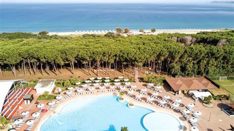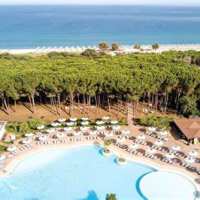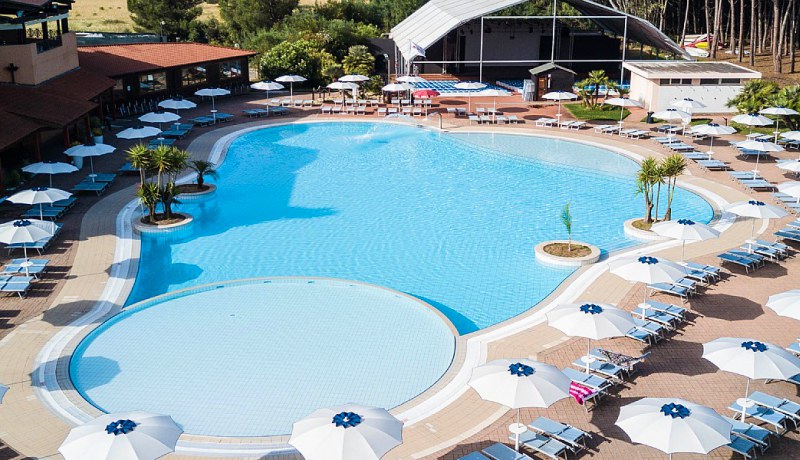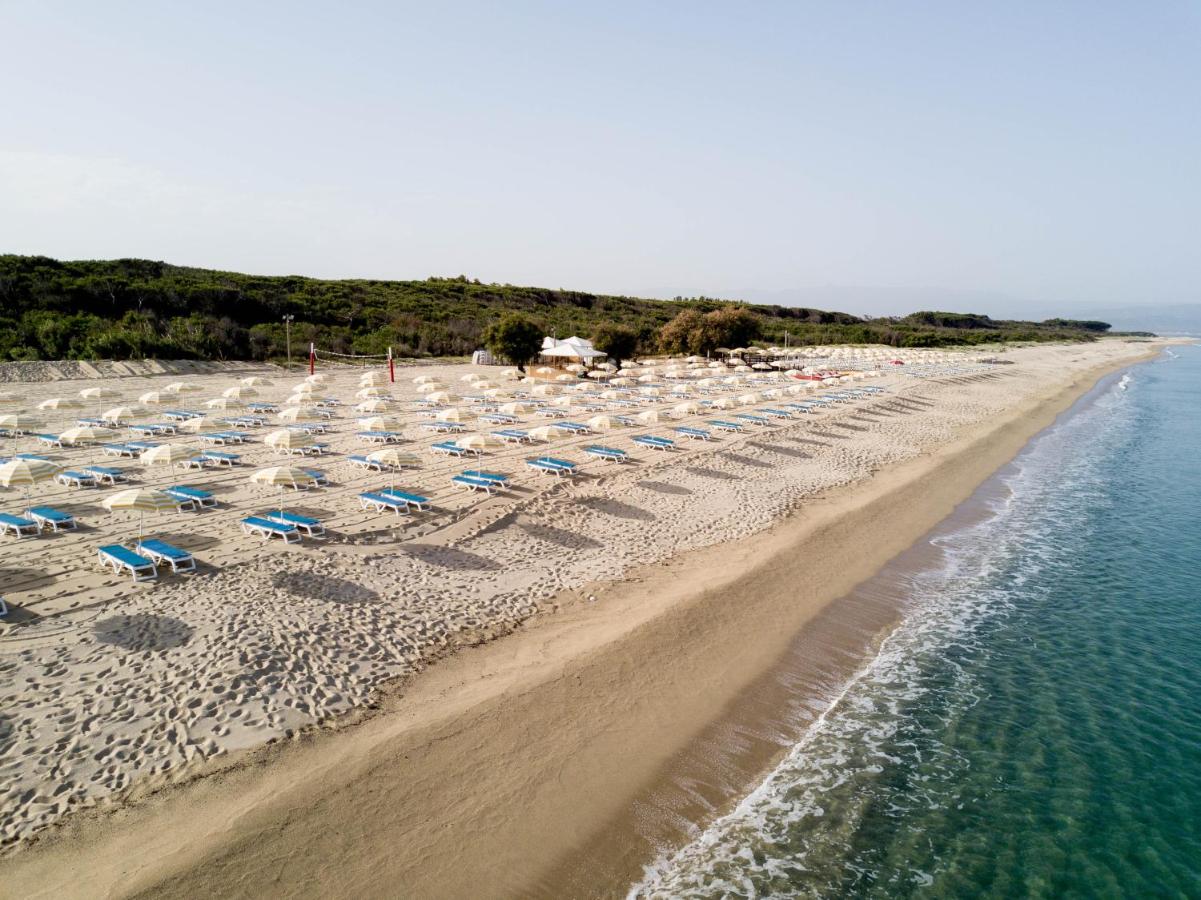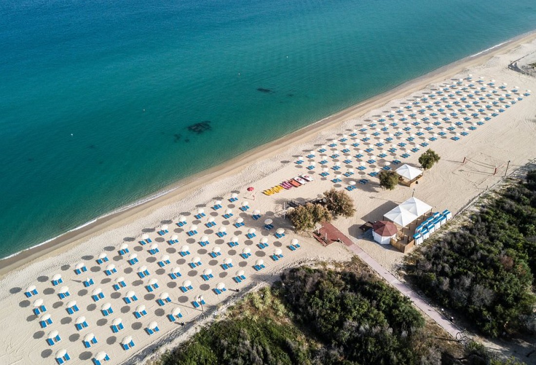 L’accesso alla spiaggia e al suo mare cristallino distano dal villaggio meno di 100 mt e vi si accede percorrendo un passaggio pedonale attrezzato, attraverso una lussureggiante e fresca pineta di macchia mediterranea con alti pini.