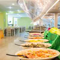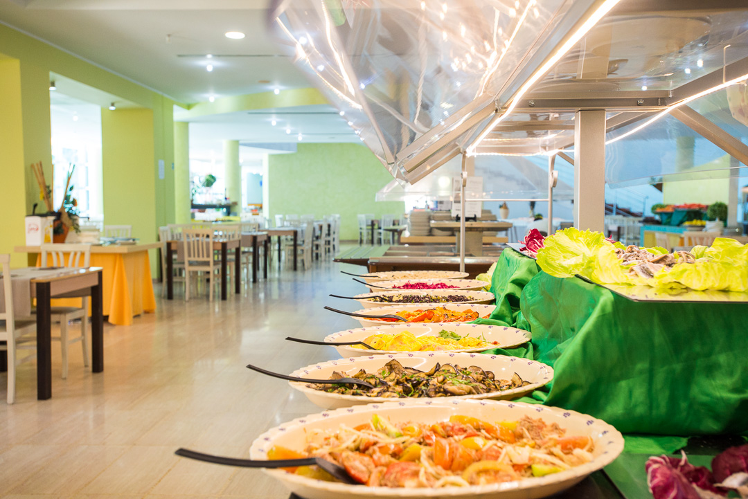 Ristorazione con servizio buffet: ampia scelta di antipasti e contorni, primi e secondi caldi, frutta a pranzo e a cena, dessert a cena, con bevande ai pasti al bicchiere (acqua, vino rosso e bianco, coca cola e aranciata alla spina).